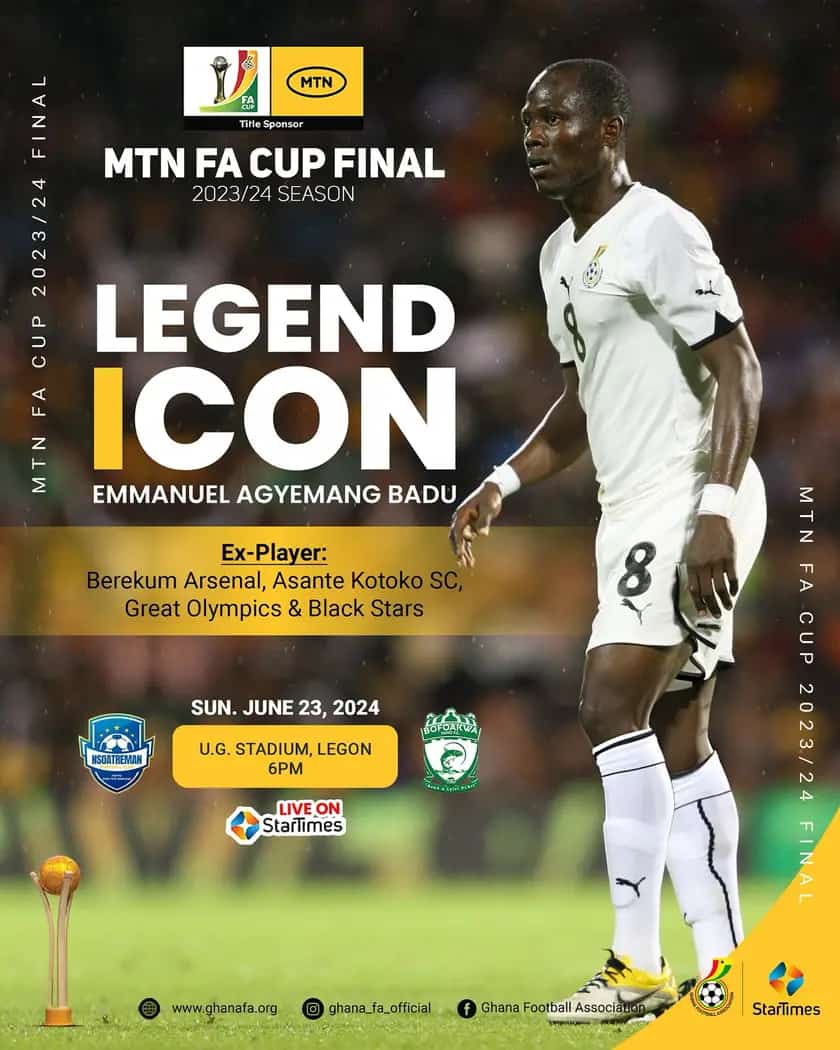 Former Black Stars player, Emmanuel Agyemang Badu has been named the Legend Icon for this year’s MTN FA Cup final between Bofoakwa Tano FC and Nsoatreman FC.