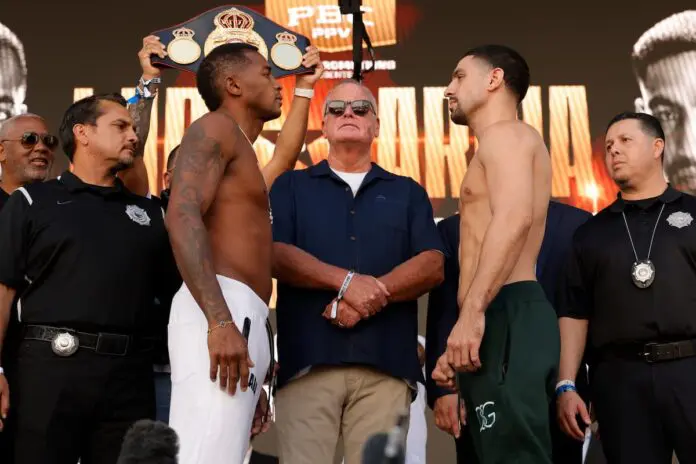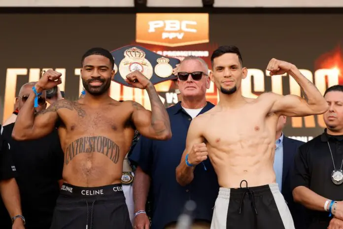 Las Vegas’ former WBA super lightweight champion Rolando Romero (15-2, 13 KOs) and Stockton-based Manuel Jaimes (16-1-1, 11 KOs) of San Jose, California showed 140.8 lbs and 139.8 lbs, respectively. The 10-round contest kicks off the action live on PPV.