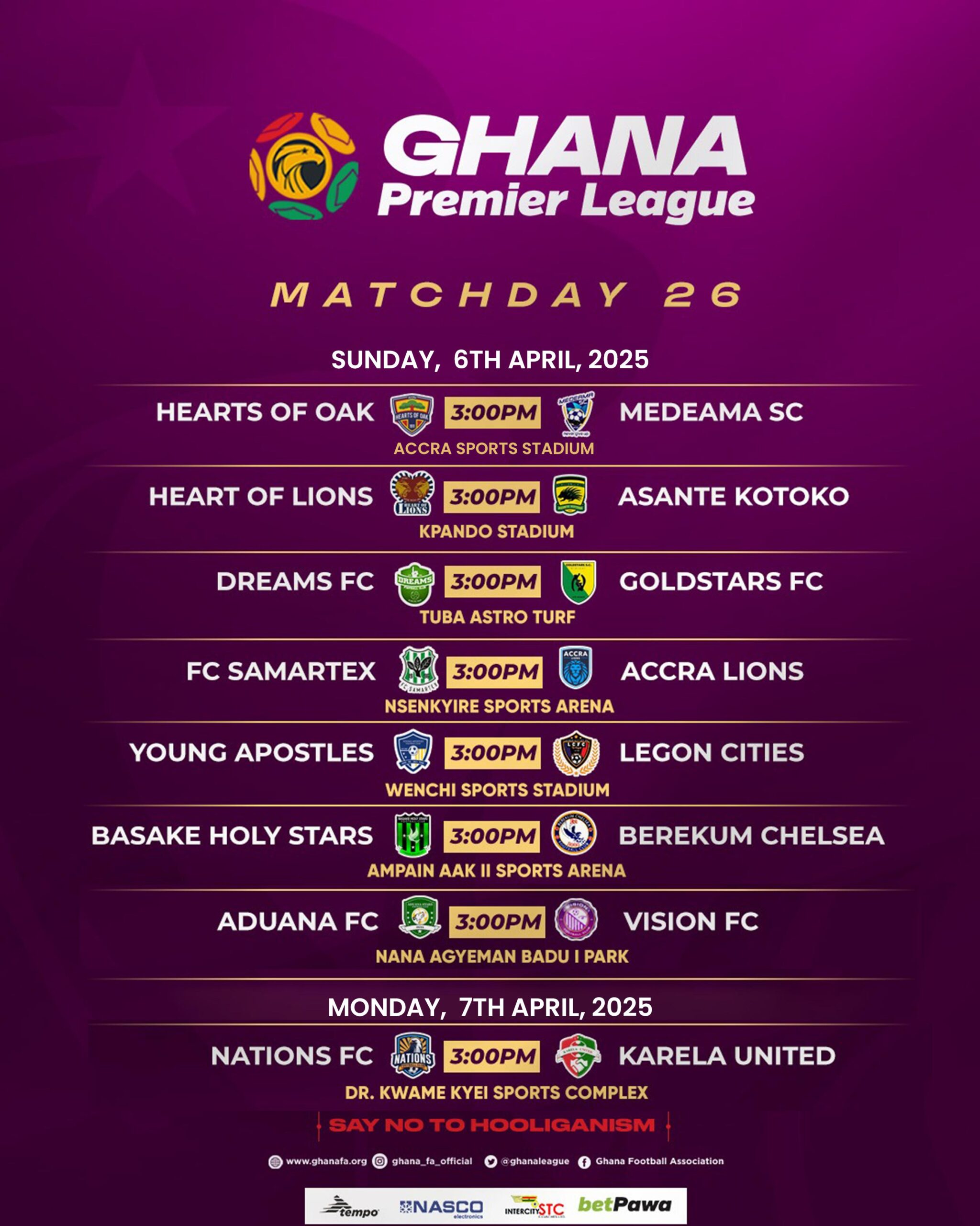 Hearts of Oak will aim to get back to winning ways when they welcome Medeama SC to the Accra Sports Stadium on Sunday April 6, 2025.
