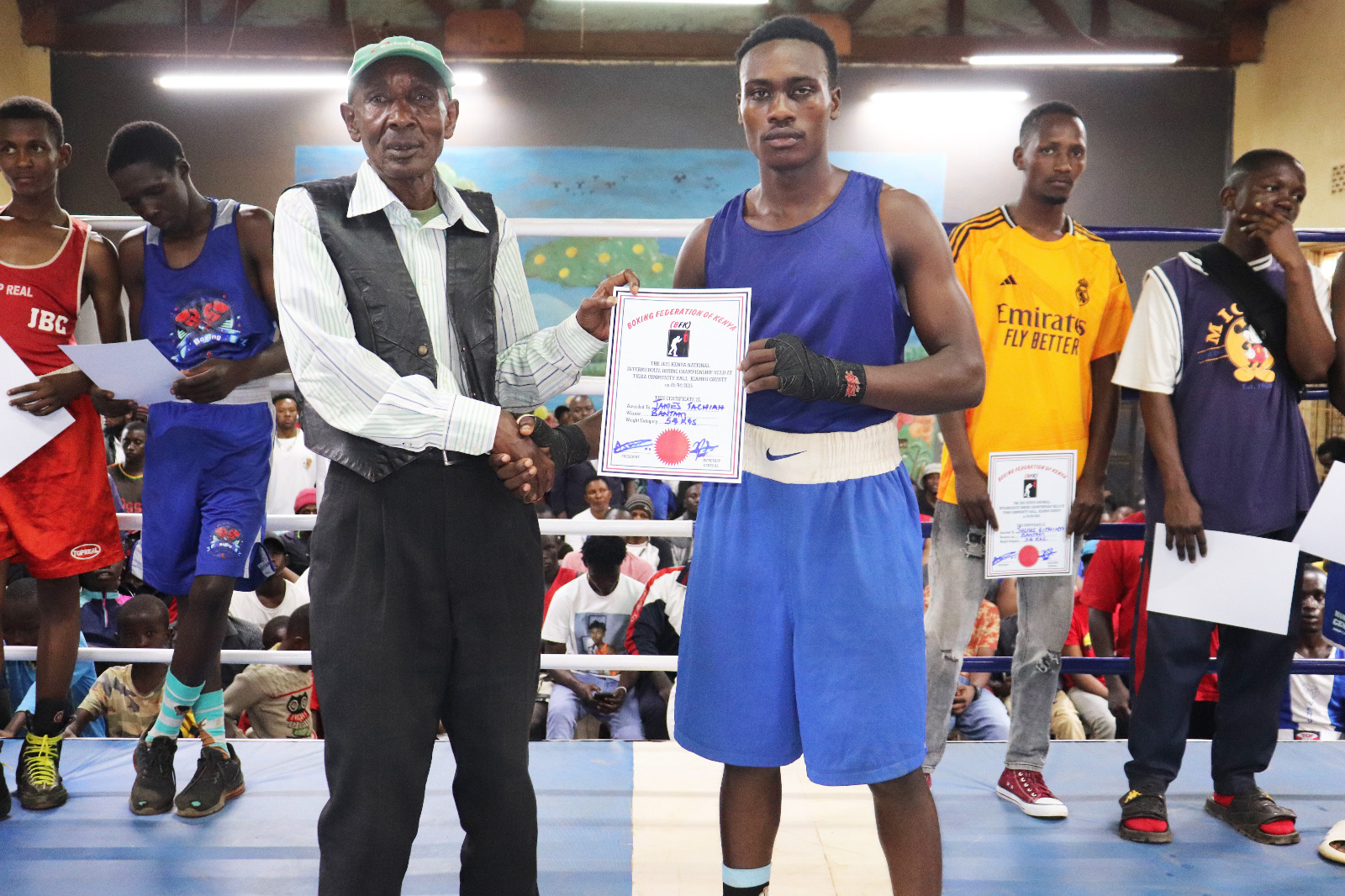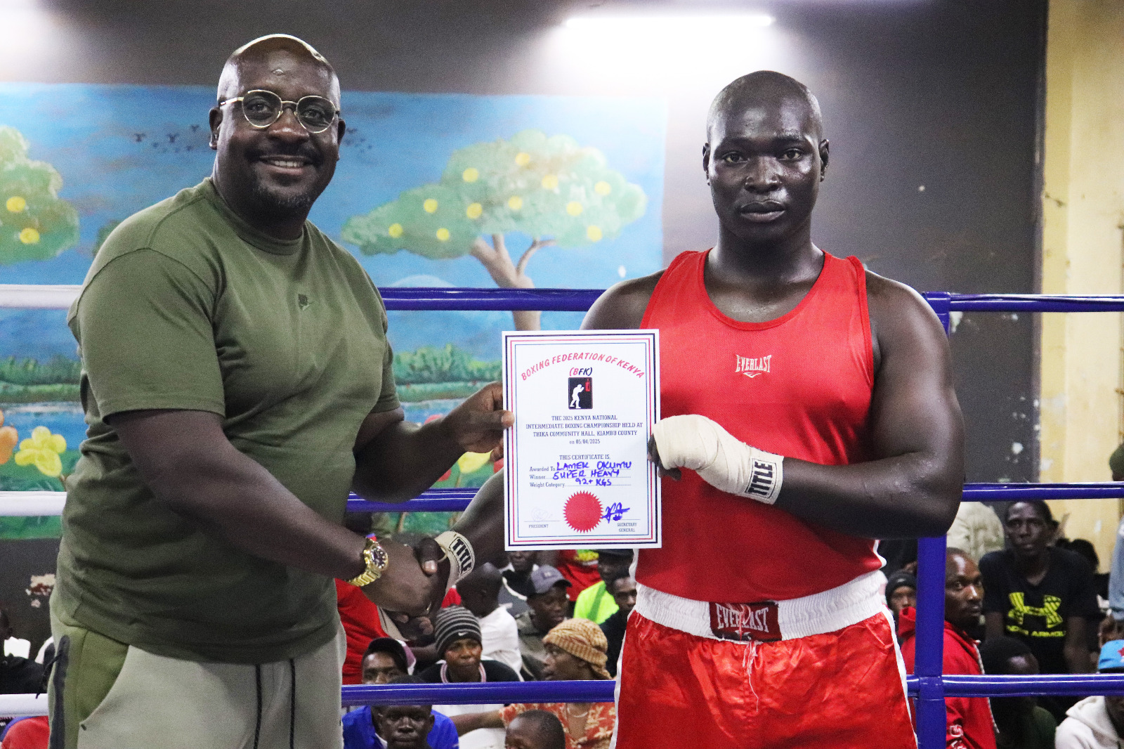 Local boxing enthusiasts at the packed Thika Community Hall erupted in wild jubilation after their homeboy, James Wanjohi stopped Ferdinand Ochieng of Kisumu County in the second round of their light middle weight final to guarantee Kiambu County’s sole triumph in the championship after a prolonged period of drought.