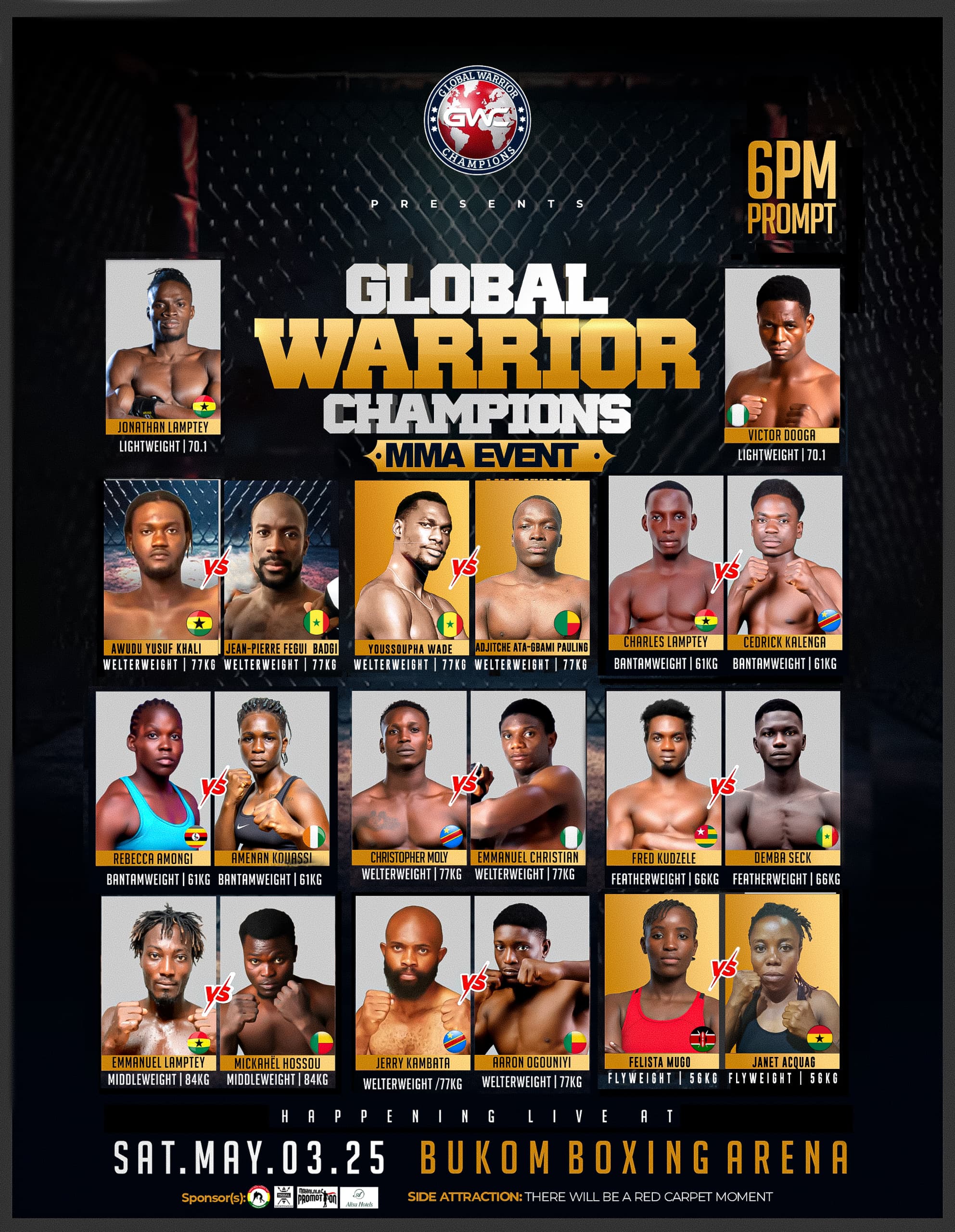 The Global Warriors Champions event will deliver an electrifying display of international mixed martial arts action at the Bukom Boxing Arena on May 3, 2025.