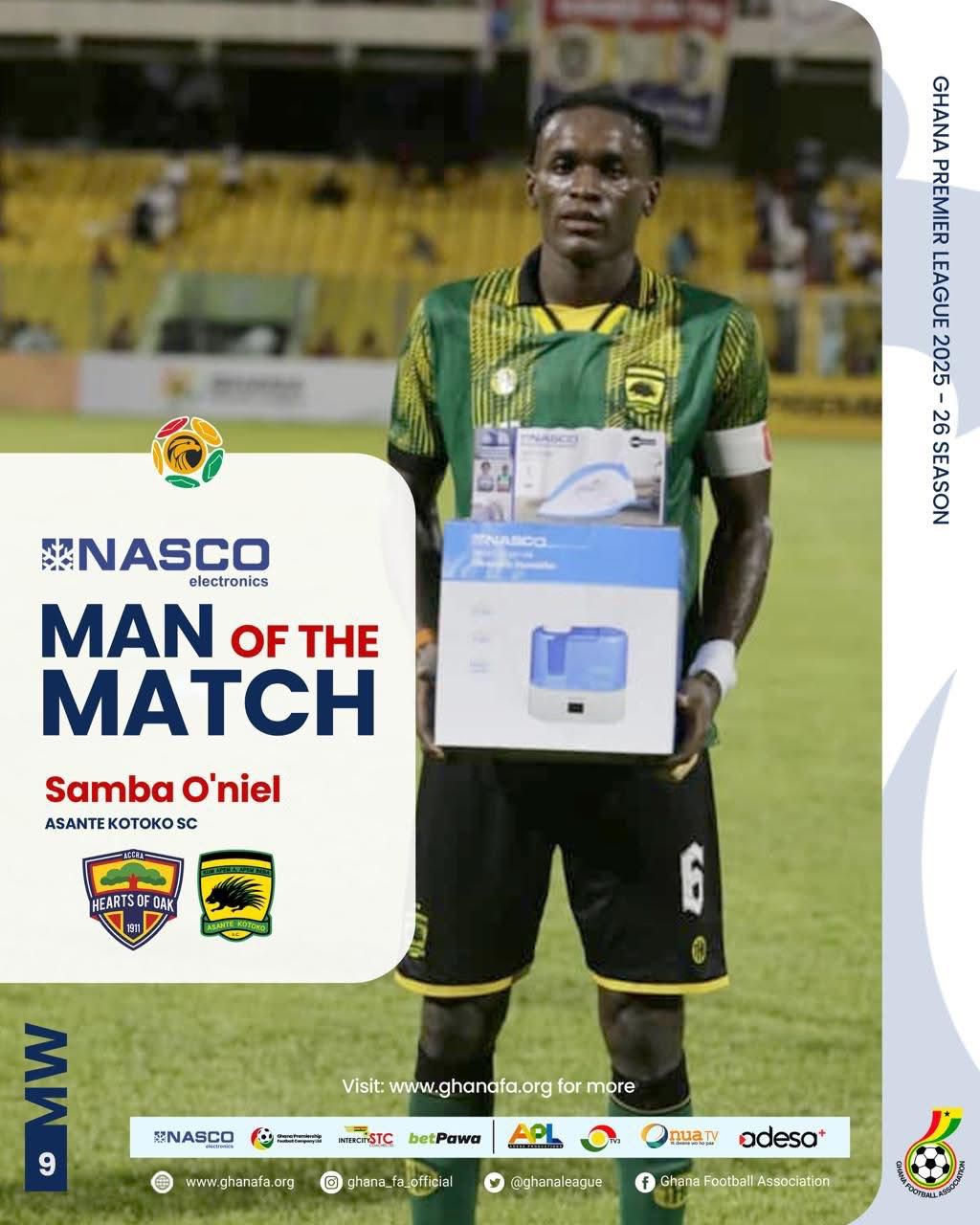 The highly anticipated match between Accra Hearts of Oak and Asante Kotoko lived up to its billing, with both teams creating plenty of scoring opportunities. However, one player stood out from the rest – Oneil Samba.