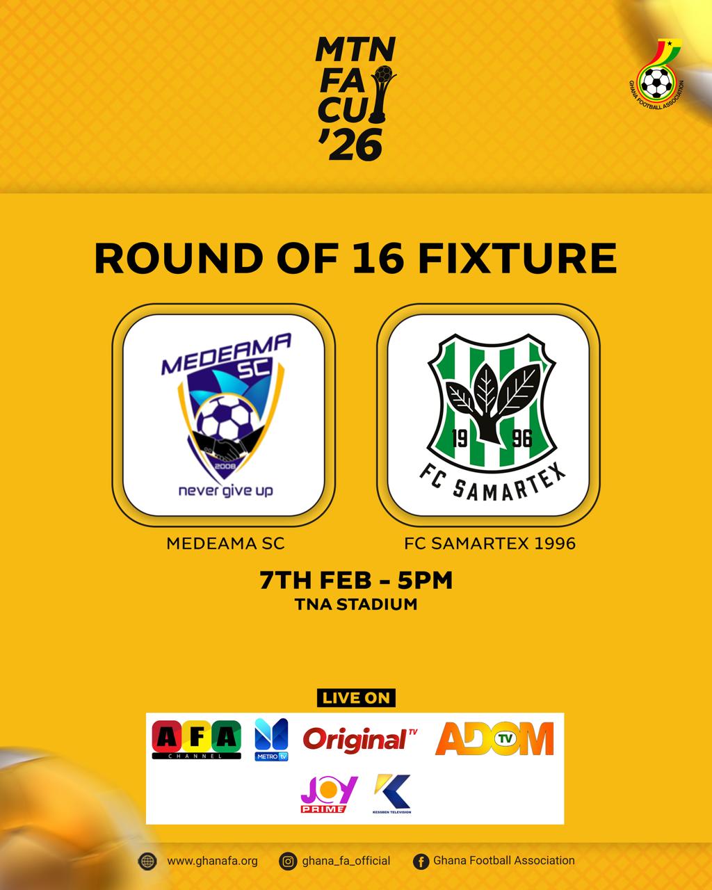 Broadcast partners AFA, Metro TV, Original TV, Adom TV, and Joy Prime will air the Medeama SC vs FC Samartex 1996 game on Saturday, February 7, at the T&A Park.