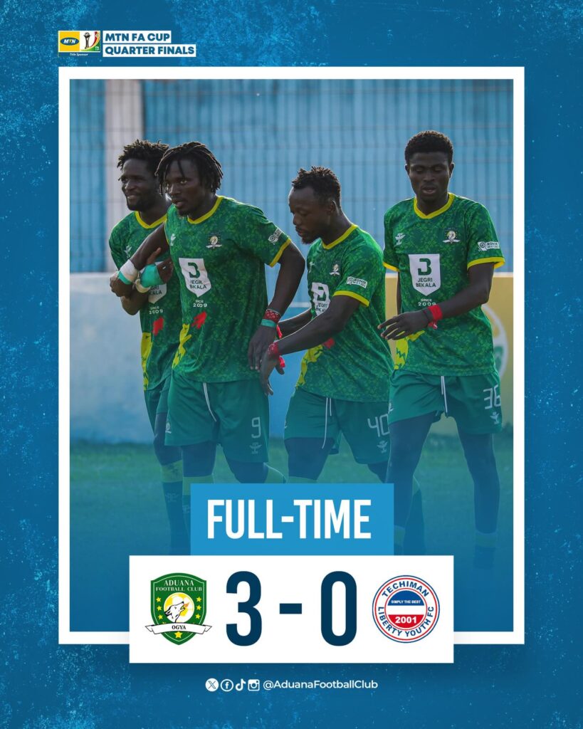 Aduana FC delivered a commanding performance to defeat Techiman Liberty Youth 3–0 and secure a place in the semi-finals of the MTN FA Cup on Saturday.