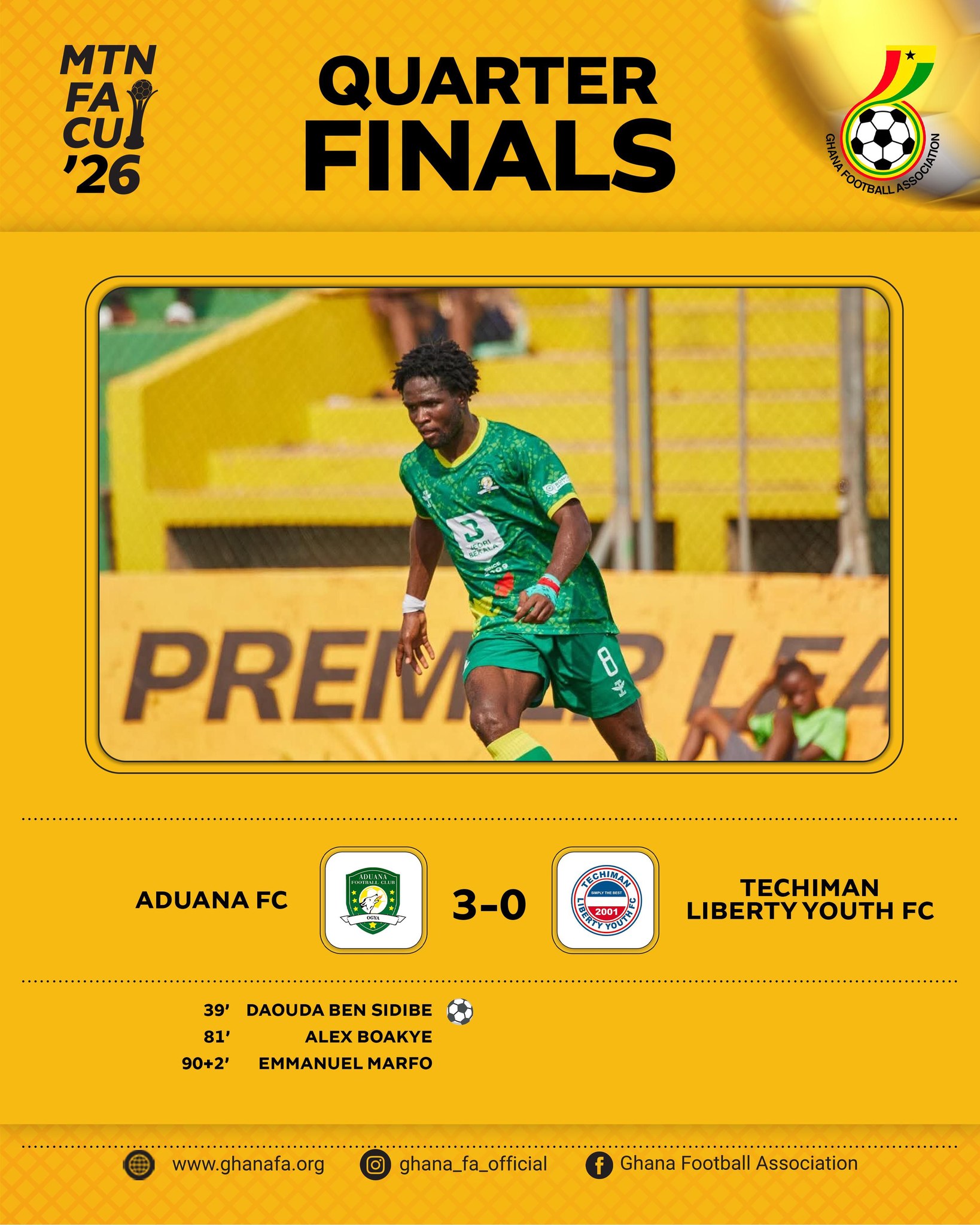 Aduana FC delivered a commanding performance to defeat Techiman Liberty Youth 3–0 and secure a place in the semi-finals of the MTN FA Cup on Saturday.